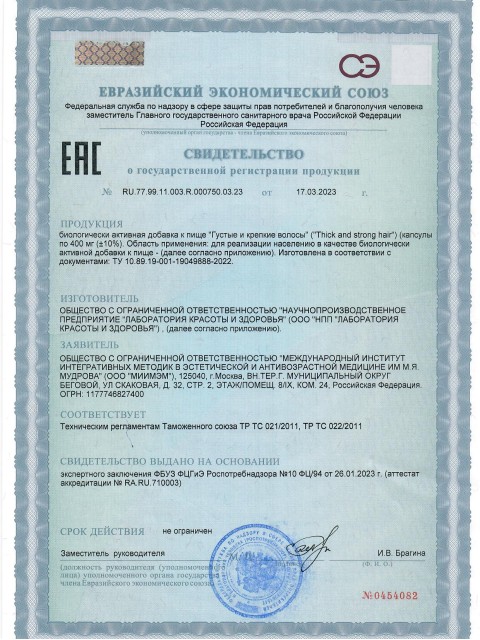 Анализ фотографий волонтеров в исходной точке, после 50 дней и после 95 дней применения БАД позволил установить увеличение объема волос: наличие новых отрастающих волос на переднем крае роста волос, на висках, уменьшение видимых участков кожи между волосами на срединном проборе и на лобно-теменных участках (вид сверху, сбоку и анфас). Волосы выглядят более здоровыми и блестящими. Перифолликулярные знаки (желтые точки, коричневые кольца) при анализе снимков не обнаружены в исходной точке и при 95-дневном применении БАД.