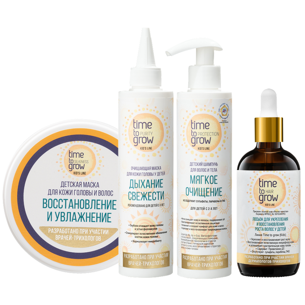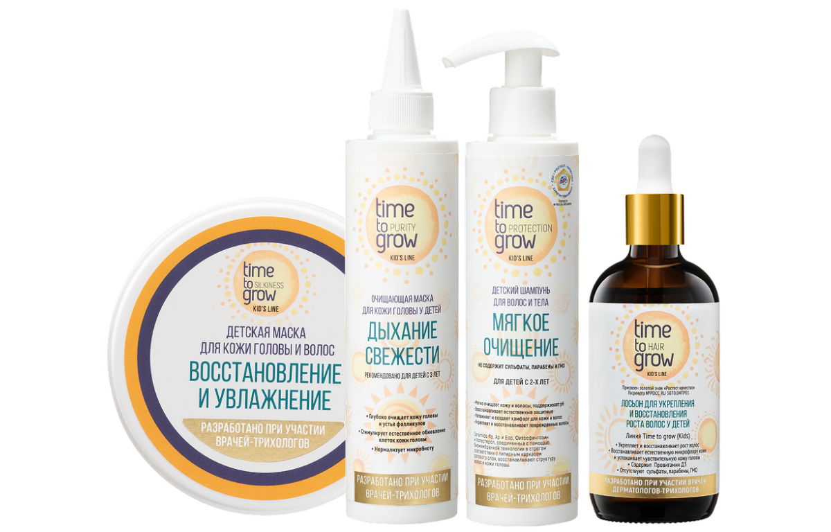 Все средства разработаны с учетом особенностей физиологии детской кожи. Не содержат сульфаты, парабены, ГМО. Имеют разрешительную документацию (сертификаты), а также экспертное заключение ФБУ «Ростест» об исследовании эффективности серии средств для детской кожи головы и волос Time To Grow.